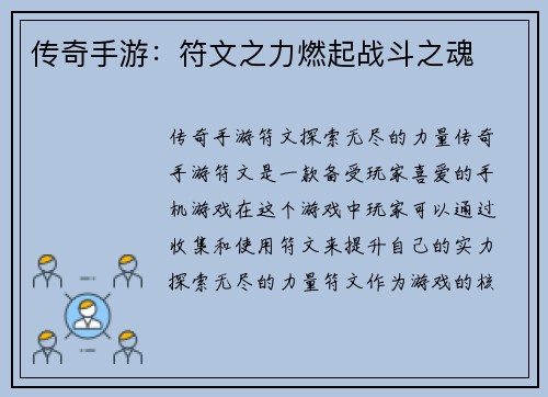 传奇手游符文:探索无尽的力量 传奇手游符文是一款备受玩家喜爱的手机游戏。在这个游戏中,玩家可以通过收集和使用符文来提升自己的实力,探索无尽的力量。符文作为游戏的核心元素,为玩家带来了无限的乐趣和挑战。...